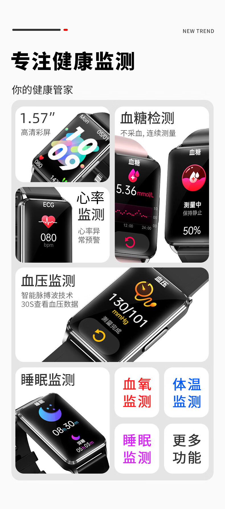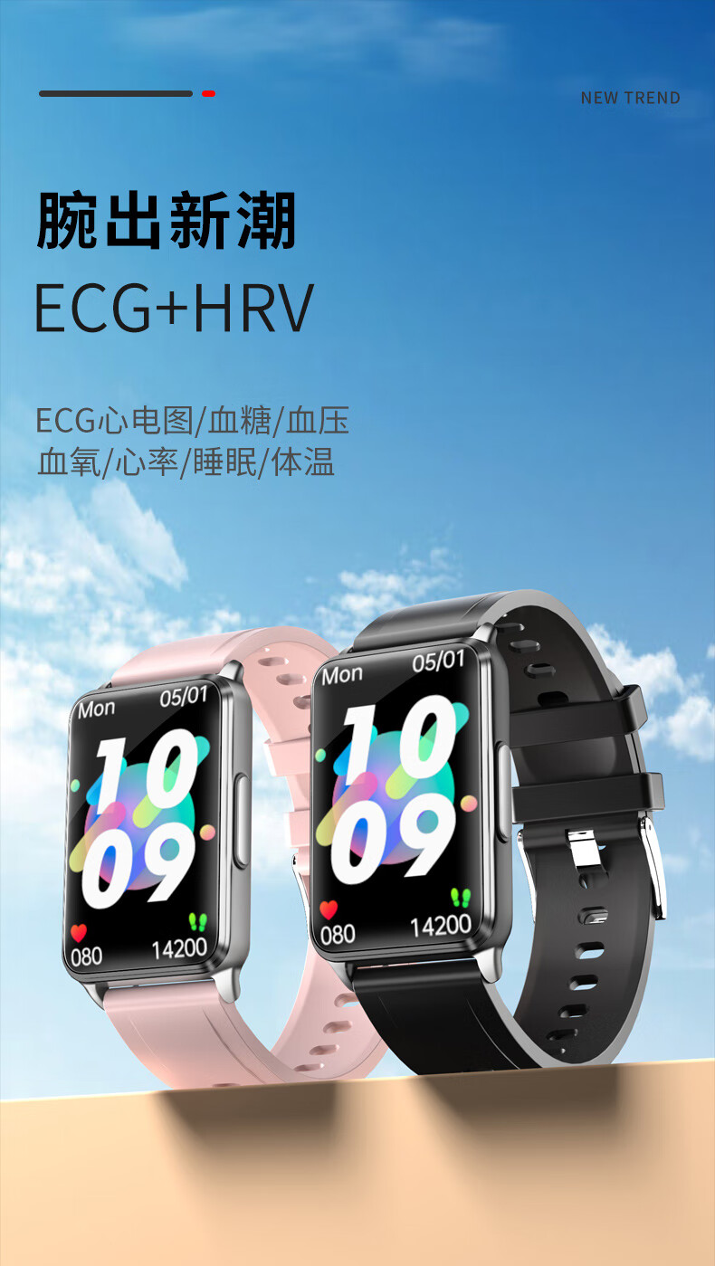 无创血糖免采血健康智能手环心电图脉搏血压血氧体温心率报警体温老人多功能运动睡眠监测仪男女ADZ 腕表 尊贵黑